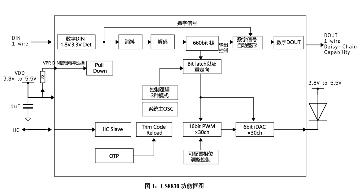 LS8830 是30 通道真16bit PWM 控制高精度且可现场矫正的恒流LED 驱动芯片。该芯片可以提供全电压范围内的高精度恒流输出,并且提供现场根据每通道LED 实际亮度分别矫正电流的能力。通过可无限级联的单线通信方式传输数据,有 3 种工作模式可选,可以从更高的刷新率和更灵活的控制模式间选择。
